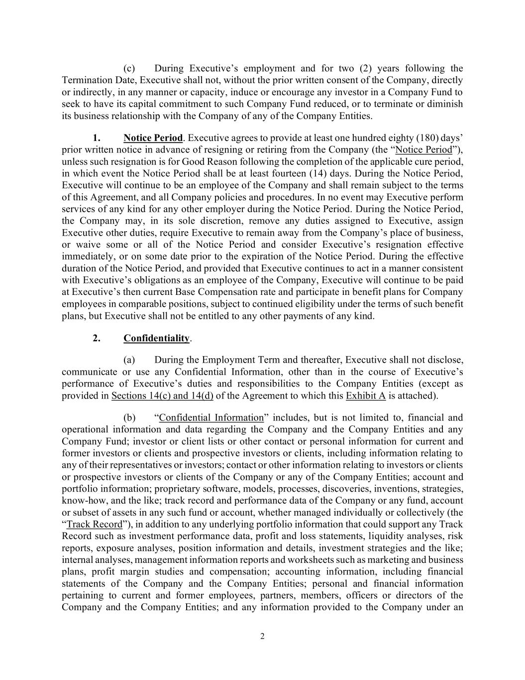 2 (c) During Executive’s employment and for two (2) years following the Termination Date, Executive shall not, without the prior written consent of the Company, directly or indirectly, in any manner or capacity, induce or encourage any investor in a Company Fund to seek to have its capital commitment to such Company Fund reduced, or to terminate or diminish its business relationship with the Company of any of the Company Entities. 1. Notice Period. Executive agrees to provide at least one hundred eighty (180) days’ prior written notice in advance of resigning or retiring from the Company (the “Notice Period”), unless such resignation is for Good Reason following the completion of the applicable cure period, in which event the Notice Period shall be at least fourteen (14) days. During the Notice Period, Executive will continue to be an employee of the Company and shall remain subject to the terms of this Agreement, and all Company policies and procedures. In no event may Executive perform services of any kind for any other employer during the Notice Period. During the Notice Period, the Company may, in its sole discretion, remove any duties assigned to Executive, assign Executive other duties, require Executive to remain away from the Company’s place of business, or waive some or all of the Notice Period and consider Executive’s resignation effective immediately, or on some date prior to the expiration of the Notice Period. During the effective duration of the Notice Period, and provided that Executive continues to act in a manner consistent with Executive’s obligations as an employee of the Company, Executive will continue to be paid at Executive’s then current Base Compensation rate and participate in benefit plans for Company employees in comparable positions, subject to continued eligibility under the terms of such benefit plans, but Executive shall not be entitled to any other payments of any kind. 2. Confidentiality. (a) During the Employment Term and thereafter, Executive shall not disclose, communicate or use any Confidential Information, other than in the course of Executive’s performance of Executive’s duties and responsibilities to the Company Entities (except as provided in Sections 14(c) and 14(d) of the Agreement to which this Exhibit A is attached). (b) “Confidential Information” includes, but is not limited to, financial and operational information and data regarding the Company and the Company Entities and any Company Fund; investor or client lists or other contact or personal information for current and former investors or clients and prospective investors or clients, including information relating to any of their representatives or investors; contact or other information relating to investors or clients or prospective investors or clients of the Company or any of the Company Entities; account and portfolio information; proprietary software, models, processes, discoveries, inventions, strategies, know-how, and the like; track record and performance data of the Company or any fund, account or subset of assets in any such fund or account, whether managed individually or collectively (the “Track Record”), in addition to any underlying portfolio information that could support any Track Record such as investment performance data, profit and loss statements, liquidity analyses, risk reports, exposure analyses, position information and details, investment strategies and the like; internal analyses, management information reports and worksheets such as marketing and business plans, profit margin studies and compensation; accounting information, including financial statements of the Company and the Company Entities; personal and financial information pertaining to current and former employees, partners, members, officers or directors of the Company and the Company Entities; and any information provided to the Company under an