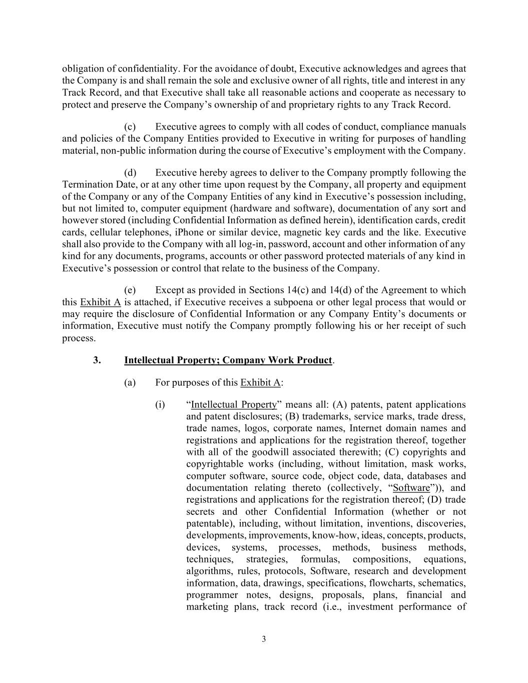 3 obligation of confidentiality. For the avoidance of doubt, Executive acknowledges and agrees that the Company is and shall remain the sole and exclusive owner of all rights, title and interest in any Track Record, and that Executive shall take all reasonable actions and cooperate as necessary to protect and preserve the Company’s ownership of and proprietary rights to any Track Record. (c) Executive agrees to comply with all codes of conduct, compliance manuals and policies of the Company Entities provided to Executive in writing for purposes of handling material, non-public information during the course of Executive’s employment with the Company. (d) Executive hereby agrees to deliver to the Company promptly following the Termination Date, or at any other time upon request by the Company, all property and equipment of the Company or any of the Company Entities of any kind in Executive’s possession including, but not limited to, computer equipment (hardware and software), documentation of any sort and however stored (including Confidential Information as defined herein), identification cards, credit cards, cellular telephones, iPhone or similar device, magnetic key cards and the like. Executive shall also provide to the Company with all log-in, password, account and other information of any kind for any documents, programs, accounts or other password protected materials of any kind in Executive’s possession or control that relate to the business of the Company. (e) Except as provided in Sections 14(c) and 14(d) of the Agreement to which this Exhibit A is attached, if Executive receives a subpoena or other legal process that would or may require the disclosure of Confidential Information or any Company Entity’s documents or information, Executive must notify the Company promptly following his or her receipt of such process. 3. Intellectual Property; Company Work Product. (a) For purposes of this Exhibit A: (i) “Intellectual Property” means all: (A) patents, patent applications and patent disclosures; (B) trademarks, service marks, trade dress, trade names, logos, corporate names, Internet domain names and registrations and applications for the registration thereof, together with all of the goodwill associated therewith; (C) copyrights and copyrightable works (including, without limitation, mask works, computer software, source code, object code, data, databases and documentation relating thereto (collectively, “Software”)), and registrations and applications for the registration thereof; (D) trade secrets and other Confidential Information (whether or not patentable), including, without limitation, inventions, discoveries, developments, improvements, know-how, ideas, concepts, products, devices, systems, processes, methods, business methods, techniques, strategies, formulas, compositions, equations, algorithms, rules, protocols, Software, research and development information, data, drawings, specifications, flowcharts, schematics, programmer notes, designs, proposals, plans, financial and marketing plans, track record (i.e., investment performance of