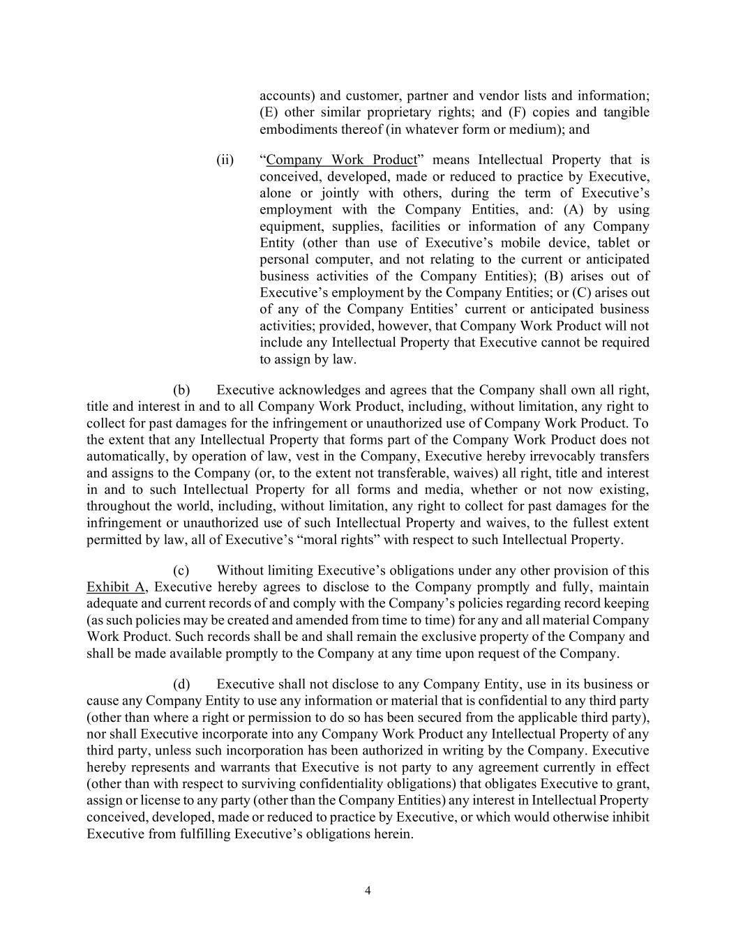 4 accounts) and customer, partner and vendor lists and information; (E) other similar proprietary rights; and (F) copies and tangible embodiments thereof (in whatever form or medium); and (ii) “Company Work Product” means Intellectual Property that is conceived, developed, made or reduced to practice by Executive, alone or jointly with others, during the term of Executive’s employment with the Company Entities, and: (A) by using equipment, supplies, facilities or information of any Company Entity (other than use of Executive’s mobile device, tablet or personal computer, and not relating to the current or anticipated business activities of the Company Entities); (B) arises out of Executive’s employment by the Company Entities; or (C) arises out of any of the Company Entities’ current or anticipated business activities; provided, however, that Company Work Product will not include any Intellectual Property that Executive cannot be required to assign by law. (b) Executive acknowledges and agrees that the Company shall own all right, title and interest in and to all Company Work Product, including, without limitation, any right to collect for past damages for the infringement or unauthorized use of Company Work Product. To the extent that any Intellectual Property that forms part of the Company Work Product does not automatically, by operation of law, vest in the Company, Executive hereby irrevocably transfers and assigns to the Company (or, to the extent not transferable, waives) all right, title and interest in and to such Intellectual Property for all forms and media, whether or not now existing, throughout the world, including, without limitation, any right to collect for past damages for the infringement or unauthorized use of such Intellectual Property and waives, to the fullest extent permitted by law, all of Executive’s “moral rights” with respect to such Intellectual Property. (c) Without limiting Executive’s obligations under any other provision of this Exhibit A, Executive hereby agrees to disclose to the Company promptly and fully, maintain adequate and current records of and comply with the Company’s policies regarding record keeping (as such policies may be created and amended from time to time) for any and all material Company Work Product. Such records shall be and shall remain the exclusive property of the Company and shall be made available promptly to the Company at any time upon request of the Company. (d) Executive shall not disclose to any Company Entity, use in its business or cause any Company Entity to use any information or material that is confidential to any third party (other than where a right or permission to do so has been secured from the applicable third party), nor shall Executive incorporate into any Company Work Product any Intellectual Property of any third party, unless such incorporation has been authorized in writing by the Company. Executive hereby represents and warrants that Executive is not party to any agreement currently in effect (other than with respect to surviving confidentiality obligations) that obligates Executive to grant, assign or license to any party (other than the Company Entities) any interest in Intellectual Property conceived, developed, made or reduced to practice by Executive, or which would otherwise inhibit Executive from fulfilling Executive’s obligations herein.