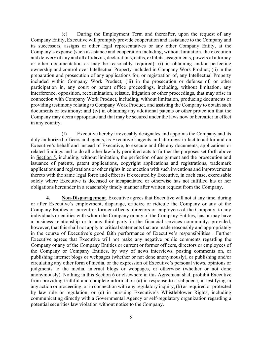 5 (e) During the Employment Term and thereafter, upon the request of any Company Entity, Executive will promptly provide cooperation and assistance to the Company and its successors, assigns or other legal representatives or any other Company Entity, at the Company’s expense (such assistance and cooperation including, without limitation, the execution and delivery of any and all affidavits, declarations, oaths, exhibits, assignments, powers of attorney or other documentation as may be reasonably required): (i) in obtaining and/or perfecting ownership and control over Intellectual Property included in Company Work Product; (ii) in the preparation and prosecution of any applications for, or registration of, any Intellectual Property included within Company Work Product; (iii) in the prosecution or defense of, or other participation in, any court or patent office proceedings, including, without limitation, any interference, opposition, reexamination, reissue, litigation or other proceedings, that may arise in connection with Company Work Product, including, without limitation, producing documents or providing testimony relating to Company Work Product, and assisting the Company to obtain such documents or testimony; and (iv) in obtaining any additional patents or other protection that the Company may deem appropriate and that may be secured under the laws now or hereafter in effect in any country. (f) Executive hereby irrevocably designates and appoints the Company and its duly authorized officers and agents, as Executive’s agents and attorneys-in-fact to act for and on Executive’s behalf and instead of Executive, to execute and file any documents, applications or related findings and to do all other lawfully permitted acts to further the purposes set forth above in Section 5, including, without limitation, the perfection of assignment and the prosecution and issuance of patents, patent applications, copyright applications and registrations, trademark applications and registrations or other rights in connection with such inventions and improvements thereto with the same legal force and effect as if executed by Executive, in each case, exercisable solely where Executive is deceased or incapacitated or otherwise has not fulfilled his or her obligations hereunder in a reasonably timely manner after written request from the Company. 4. Non-Disparagement. Executive agrees that Executive will not at any time, during or after Executive’s employment, disparage, criticize or ridicule the Company or any of the Company Entities or current or former officers, directors or employees of the Company, to any individuals or entities with whom the Company or any of the Company Entities, has or may have a business relationship or to any third party in the financial services community; provided, however, that this shall not apply to critical statements that are made reasonably and appropriately in the course of Executive’s good faith performance of Executive’s responsibilities . Further Executive agrees that Executive will not make any negative public comments regarding the Company or any of the Company Entities or current or former officers, directors or employees of the Company or Company Entities, by way of news interviews, posting comments on, or publishing internet blogs or webpages (whether or not done anonymously), or publishing and/or circulating any other form of media, or the expression of Executive’s personal views, opinions or judgments to the media, internet blogs or webpages, or otherwise (whether or not done anonymously). Nothing in this Section 6 or elsewhere in this Agreement shall prohibit Executive from providing truthful and complete information (a) in response to a subpoena, in testifying in any action or proceeding, or in connection with any regulatory inquiry, (b) as required or protected by law rule or regulation, or (c) in pursuing Executive’s Whistleblower Rights, including communicating directly with a Governmental Agency or self-regulatory organization regarding a potential securities law violation without notice to the Company.
